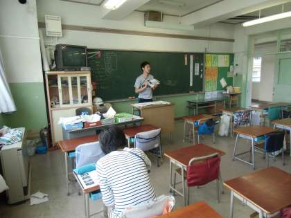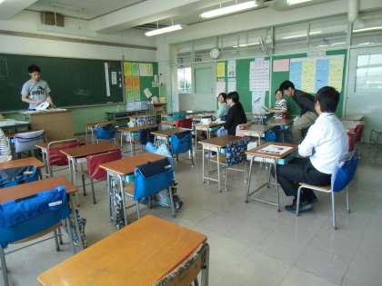副校長による、若手教員養成道場が行われています。模擬授業といって、若手が1人教員として授業を行い、他の教員は子供役で参加します。質問したり、指名されて応えたりします。意図が不明確な発問(子供への問いかけのこと)をすれば、待ってましたとばかりに、関係のない答えが浴びせかけられます。つまらないなと思えば、手いたずらをはじめる人もでてきます。その後、各教員から指導を受けます。