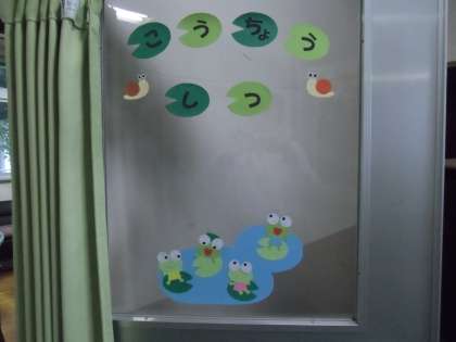 子供たちにとっては、非常に敷居の高い校長室ではあります(私自身も愉快な思い出はあまりありません)が、敷居を少しでも低くしましょうということで、カエル好きな私にちなんでふさわしい飾り付けをしてもらいました。
