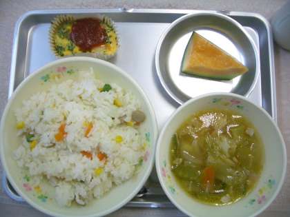 今日は洋食の日♪ごはんにウインナーの輪切りの他、にんじん・たまねぎ・