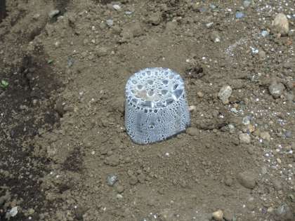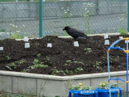午後、畑を眺めているとカラスが一羽。カコン、カコンと不思議な音をさせています。何だろう。近くに寄ってみてみると、「ああ、このカップをくちばしで叩いて音をだしていたのか」と納得しました。