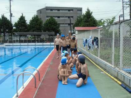 プール開きのあと、体操してシャワーを浴びました。少しばかり冷たかったようです。大切なバディーの確認もしました。