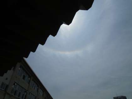 太陽のまわりに、虹の輪ができていると。「校長先生、私ら撮ってる場合じゃないよ。荒れ撮ってよ。」とリクエストされました。