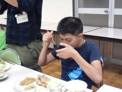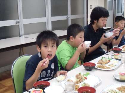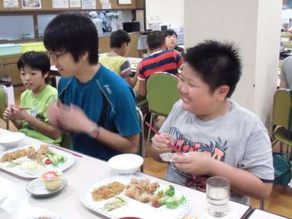 食堂の人も、その食べっぷりにおどろいて、カウンターの向こうで目をまん丸にしてこちらを見ています。「小学生…だよねぇ、みなさん」