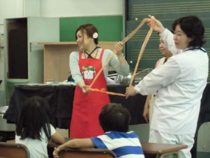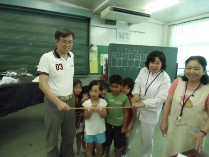 クイズの最後の一問は、大釜の周りをスズランテープで測ってきました。さて、この中に校長と一体何人の子供たちが入れるでしょうか、という問題でした。