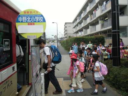 バス停「中野北小学校」で、時間まで待ちます。保護者の方も心配そうです。