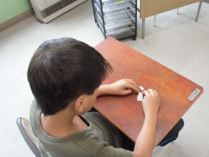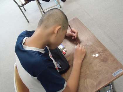1平方センチメートルのタイルを敷き詰めて、広さを測ります。うまく敷き詰めずに苦心しています。