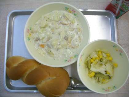 今日は洋食メニューの日♪マーガリンが練りこまれたパンに、給食室の