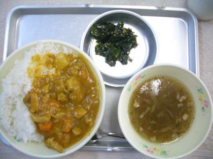 今日のカレーは、鶏肉を使った“チキンカレー”です。給食室自慢の