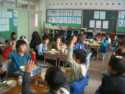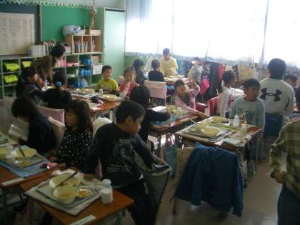 写真は、1年生と3年生の給食の様子です。おかわり希望者がバンバン
