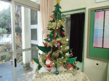 図書ボランティアのみなさんの手作りクリスマスツリーが図書館に飾られています。すべて、リサイクル品によってまかなわれているそうです。