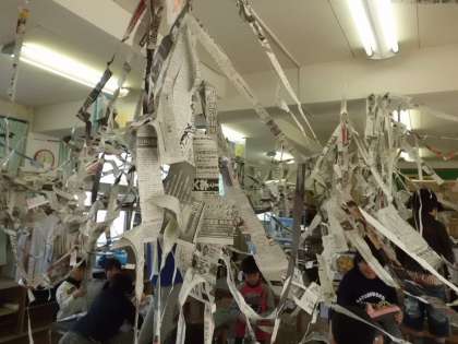 新聞紙を長く切って、