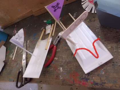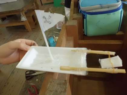 ものの5分くらいで、ゴム動力の船をつくりあげ、