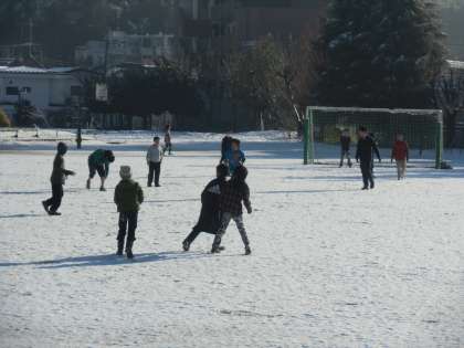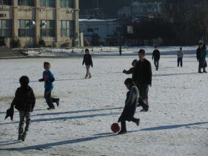 校庭が雪が積もっていました。「覆われている」といった方が適切な表現でしょうか。早速校庭に飛び出して、いつもとは違った感触を楽しんでいるようでした。