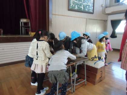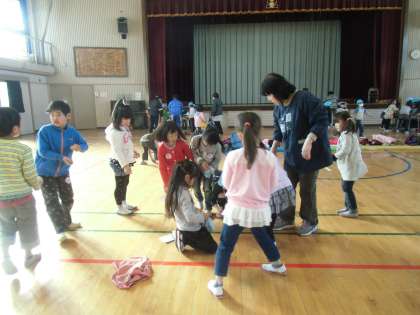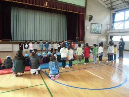 いい姿勢で、大きな声で、はきはきと、みんなの前で発表します。歓迎の式のあとは、いよいよ一緒に遊びます。