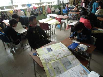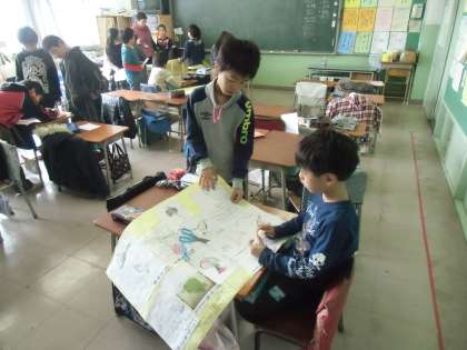 発表用に、調べたことを模造紙にまとめています。