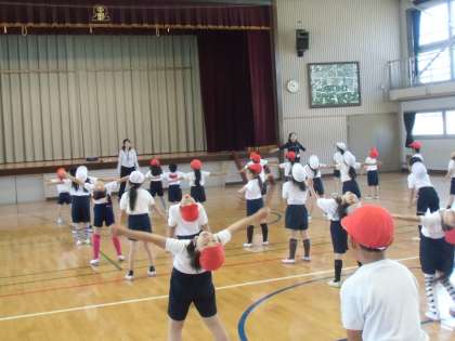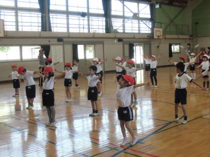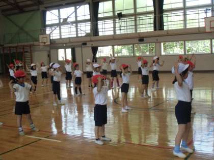 険しいぞ、この道は。1,2年生が運動会練習の準備体操として「ラジオ体操」の練習をしています。
