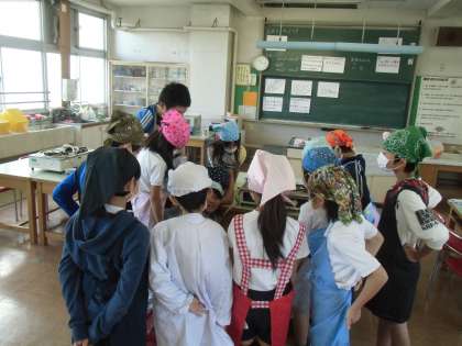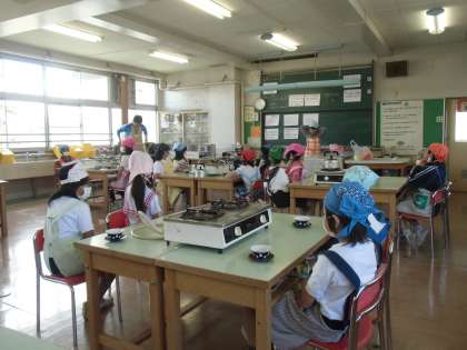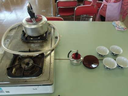 5年生、初めての調理実習です。包丁を使って果物を切り、お茶を煎れます。