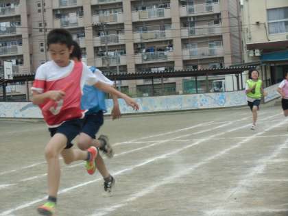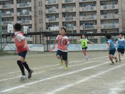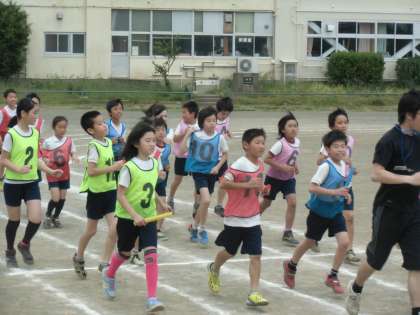 給食前のわずかな時間を活用して、リレーの指導を行っています。