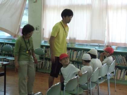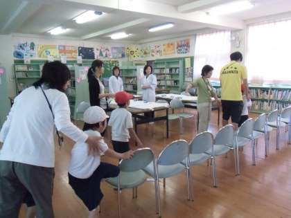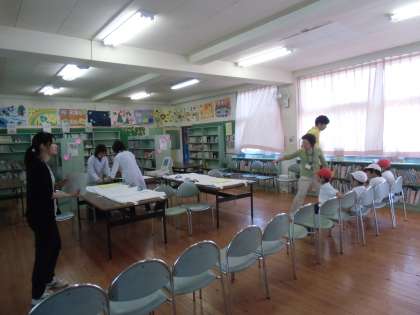 図書館のカーテンを引いて、普段のってはいけない机にシートを用意して、心臓検診の用意が調いました。