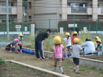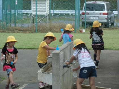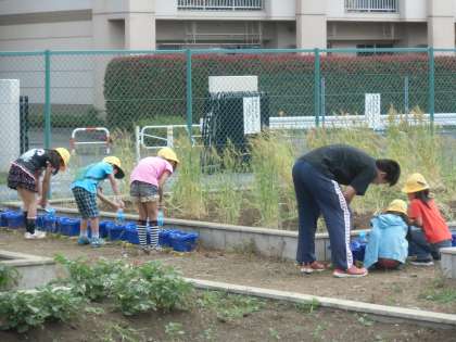 金曜日にまいたあさがおの種。もう芽が出てきました。「校長先生、5本も出たよ」「3本でた」「1本しか出ない」悲喜こもごもです。自分のあさがおが、大きく・きれいな花を咲かせられるよう、一生懸命に水をあげています。