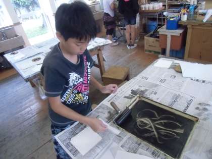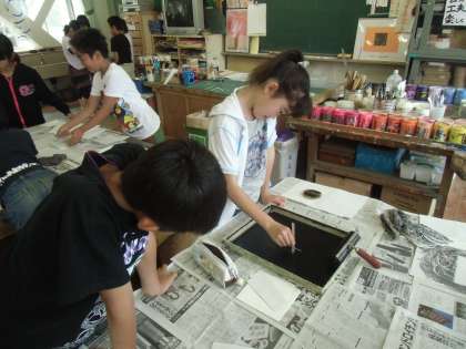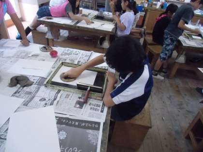 「版画はさぁ、はがすときが一番ドキドキするんだよね」と手本を見せる図工の教員からのひと言。そろりそろりと、はがします。子供たちから「おーっ」と歓声があがります。