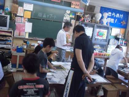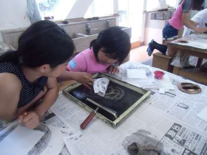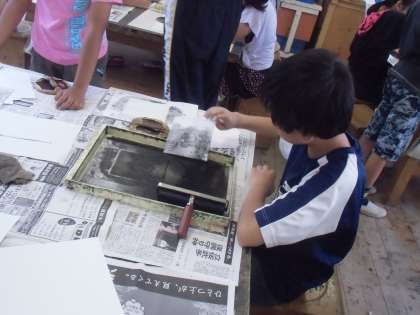一人一人は、1枚1枚違った作品を刷り上げていきます。二度と同じものはできないので、この作品は世界にたった1枚だけ。レアものだ。