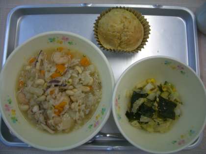 さらに、給食室手作りのくるみのマフィンは、しっとりした生地の中に香ばしいクルミとアーモンドの食感が良く、好評でした!