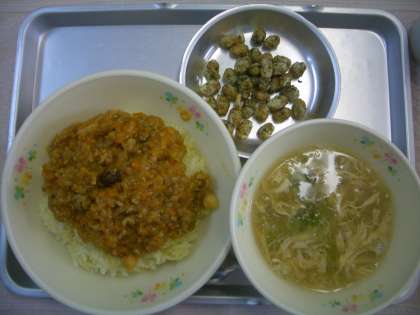 豆は普段、子どもたちに敬遠されやすい食材ですが、今日のようにカレーに入れたり、片栗粉をまぶして油で揚げ、青のりと塩を振っていただく『ポップビーンズ』は、子どもにも好評です☆ちょっと手をかけると、子どもたちの苦手意識も変わるきっかけになります。