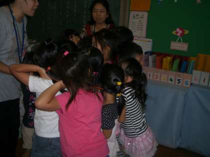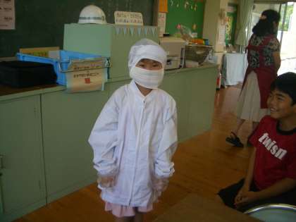 調理員の作業着はどんな着心地かな?給食室で使っている道具のクイズ・回転釜の円周を測ったヒモに、子どもが何人入るか?など、大盛り上がり!クイズに優勝した班は、『きゅうしょくはかせメダル』がもらえました☆