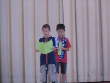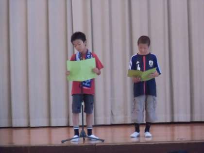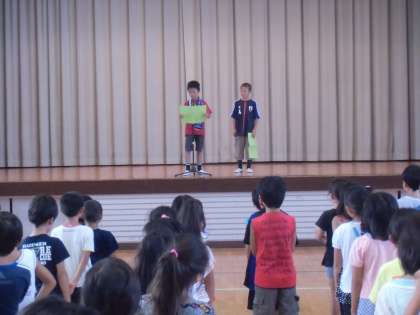 始業式の児童代表の言葉は、4年生からでした。1学期の反省を基に、2学期の目標を堂々と全校児童の前で発表することができました。