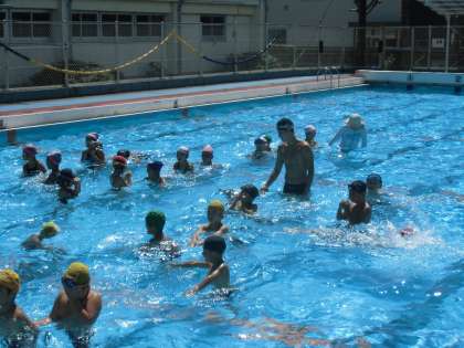 先月までに比べると、吹いてくる風を日陰で感じる分には涼しく感じられるようになりました。でも、まだまだ、太陽はギラギラです。1,2年生の水泳指導ですが、だれも寒がることなく、まだ夏のように歓声を上げています。顔をつけたり、そっと浮いたりできるようになったかな。