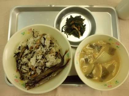 今日のごはんは『ひじきごはん』でした。ひじき・油揚げ・にんじん・しいたけ・青大豆をさとう・しょうゆで味をつけ、風味づけにバターが入っていました。ひじきは、海藻の中でも特に鉄分などのミネラルが豊富です。今日は残念ながらひじきと大豆の残しが多くありました。