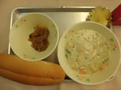 今日のチャウダーは豆乳を使ったチャウダーでした。帆立のほかにはベーコン・にんじん・玉ねぎ・いんげんが入っていましたが、今日は残念ながら残しが目立ちました・・・。