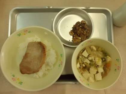 『海鮮どうふ』には干しほたて・えび・豚肉・にんじん・ねぎ・たけのこ・はくさい・しいたけ・ちんげん菜が入って、とても野菜たっぷりでしたが、残念ながら野菜の残しが目立つ学年も・・・。残念ながら最近、野菜の残しが目立っています。
