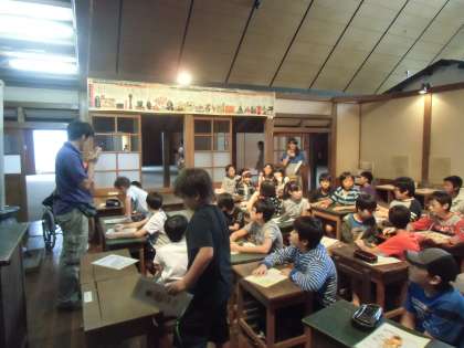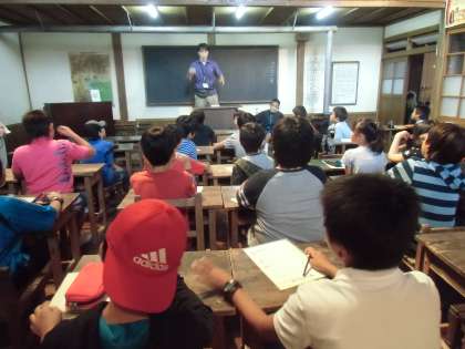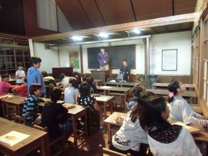 博物館の中には、昭和30〜40年代の小学校の教室が再現されていました。いつの間にか、普段の教室の自分の席に着席している子供たち。あれれ、先生からの連絡も始まりました。