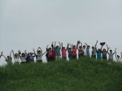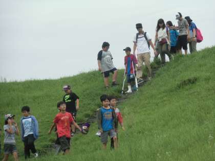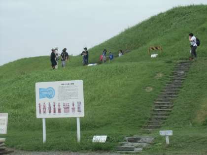 石室内は天井が低いので腰が痛くなってしまい、早めに出てしまいました。子供たちは室内から出ると、古墳の最上部まで登っていきました。この頃にはすっかり雨も上がっていました。