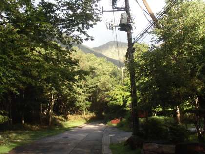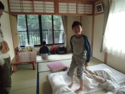 宿舎の前で、朝の会です。みんなちゃんと歯を磨いて、顔を洗ってきたんだろうね。天気は、もちろんいい天気です。