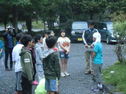 朝です。宿舎の周りはもやに包まれています。静かに(ねむそうに)朝の会が行われました。