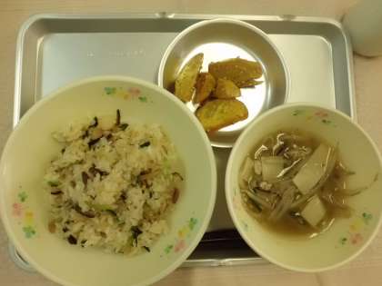 今日のご飯は『ちゅうかおこわ』でした。豚肉・たけのこ・しょうが・長ねぎ・えび・ほたて・しいたけ・小松菜・松の実が入ったおこわです。味付きのご飯でしたがあまり食べてもらえませんでした・・・。