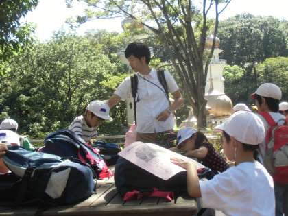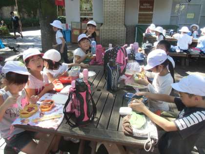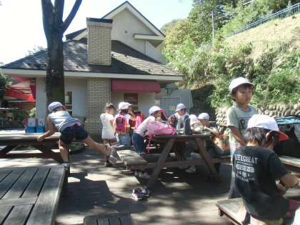 ライオンバスのあとはグループ活動でした。すべてのチェックポイントをまわったグループからお昼の用意です。みんな仲よく、迷子もださずに戻ってきました。