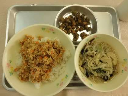 そぼろどんは人参、しいたけ、高野豆腐、長ネギをみじん切りにし、押し麦を混ぜたごはんの上にかけました。高野豆腐の食べなれない食感に戸惑い気味の子もいましたが、食べてみると汁気を含んでジューシーで、美味しいと言って食べていました。