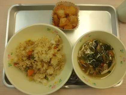 ジャンバラヤはご飯をバターで炒め、えび、ベーコン、玉ねぎ、人参、コーン、グリーンピース、セロリを入れて、トマト、塩こしょう、チリパウダーで味付けしました。程よい甘みの味つけが子供たちには食べやすかったようで、どのクラスもよくおかわりをして、ほとんど残食がありませんでした。ピザポテトも春雨スープもどのクラスもよく食べていました
