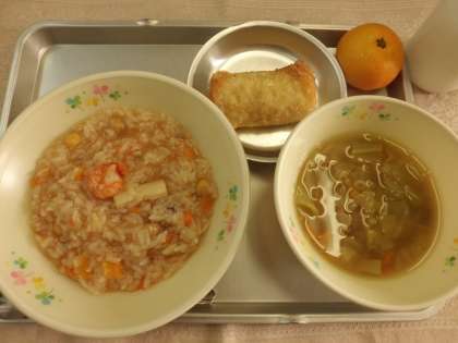 スペインふうリゾットはいか、たこ、えびなどの魚介がたくさん入ったトマト味のリゾットでした。子供たちはよく食べていて、ほとんど残食はありませんでした。
