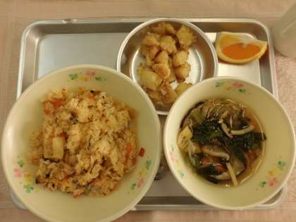 少〜しだけ辛さのあるキムチチャーハンは、1年生でも食べられる子と苦手という子がいました。味覚の発達にはばらつきがありますね。