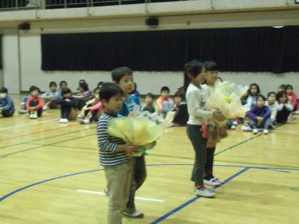上級生からのプレゼントです。メダル、鉢植えのお花、校歌の歌詞(教室掲示用)。