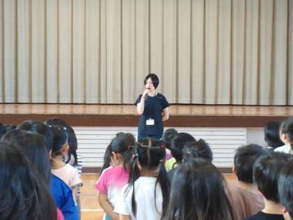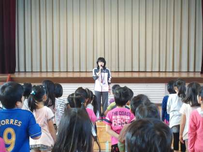 次に、日直の先生が、今週の目標について話し、生活指導主任から遊具の使い方や、休み時間についてお話しがありました。
