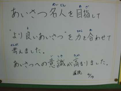 あさひ学級には、写真のような取り組みが貼ってありました。今年の中北小の生活面の重点目標はあいさつですから。