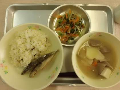 1年生は初めて給食で五穀ごはんでしたが、つぶつぶした見た目が少し苦手そうでした。