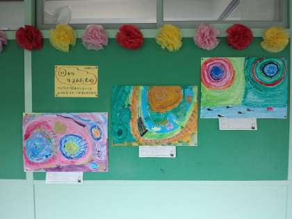 昨日、あさひ学級の子供たちと一緒に給食を食べに行ったところ、ちょうど図工の作品を講師の先生が廊下の掲示板に貼ってくださっていました。とてもいい作品でした。