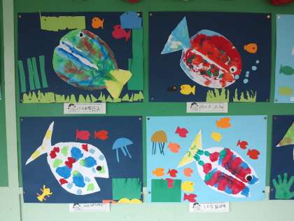 昨日、あさひ学級の子供たちと一緒に給食を食べに行ったところ、ちょうど図工の作品を講師の先生が廊下の掲示板に貼ってくださっていました。とてもいい作品でした。